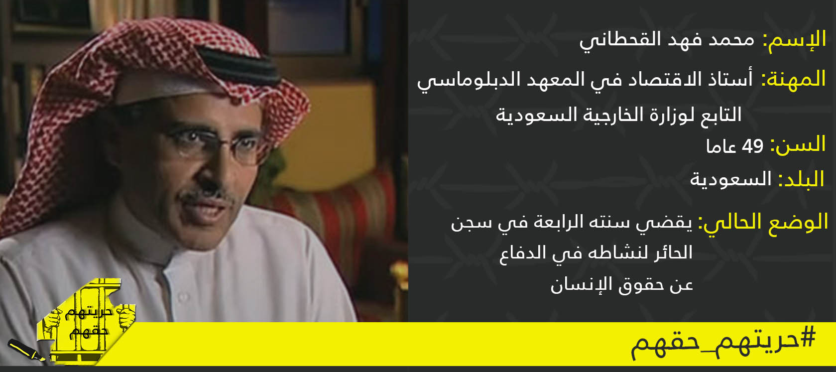 حملة “حريتهم حقهم” تعلن الدكتور محمد فهد القحطاني سجين شهر أكتوبر/ تشرين الاول 2016