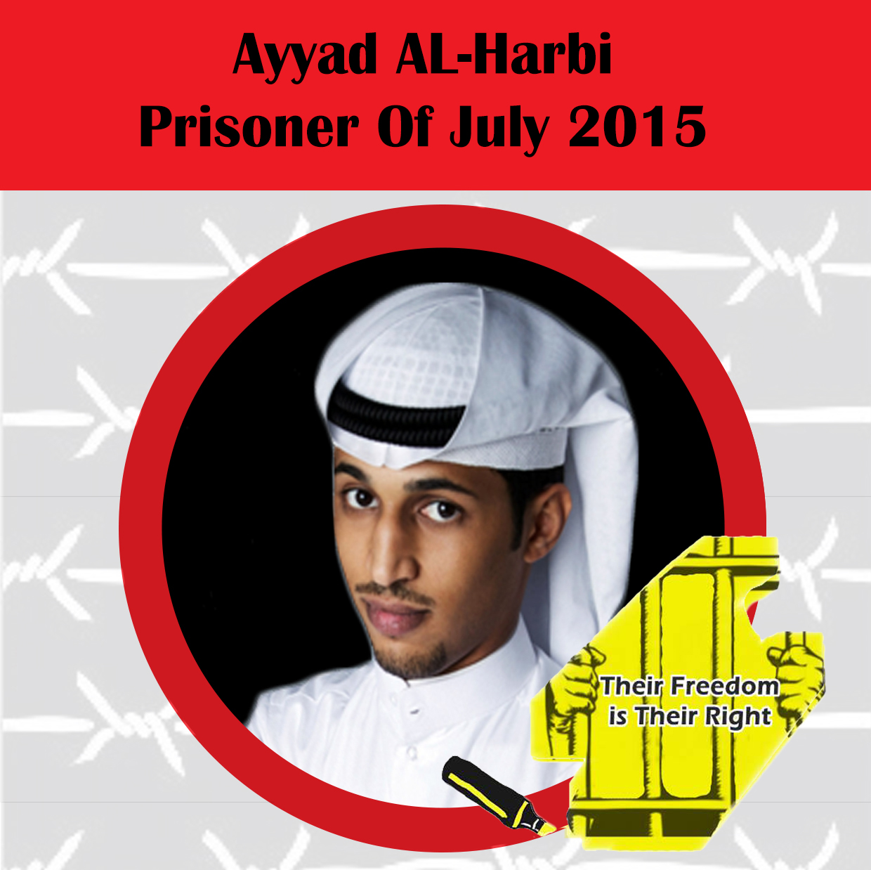 10- Publish images of Ayyad al-Harbi and some information about him on your Facebook & Twitter accounts and use this hashtag #حريتهم_حقهم