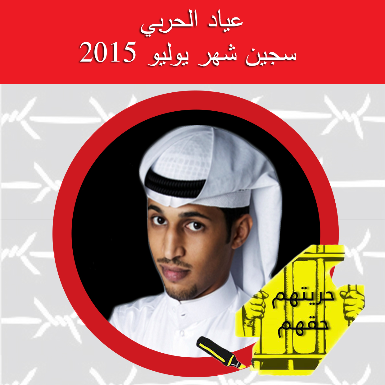 الصحافي والناشط الكويتي عياد الحربي كاتب في صحيفة “سبر”، اعتقلته السلطات الكويتية فجر الخميس 22 تشرين الأول/أكتوبر 2014، لتنفيذ حكم صدر ضده بالسجن عامين بسبب تغريدة اعتبرتها المحكمة مساسا بـ”الذات الأميرية”. وكانت محكمة الاستئناف قد قضت بسجن الحربي في 22 أيار/مايو 2014، بعد سلسلة من المحاكمات، إلا أن الحكم لم ينفذ في ذلك الوقت بسبب طعن قدمه الحربي بعدم دستورية المادة 25 من قانون رقم 31 لسنة 1970،. لذا، تم وقف تنفيذ الحكم، وإخلاء سبيل الحربي بكفالة مالية قدرها ألف دينار كويتي، (3300 دولار أمريكي)، ومنعه من السفر لحين الفصل في الطعن الدستوري. وفي 5 نيسان/أبريل الماضي، أصدرت محكمة كويتية حكما نهائيا بالحبس لمدة عامين.